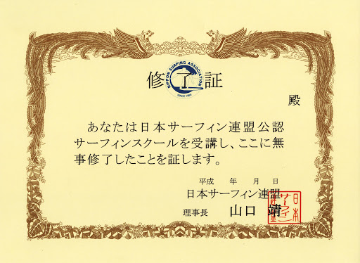 万が一に備え、同連盟の障害保険を利用できるほか、スクールテキストやルール&マナーブック等も配布します。スクール終了時には、日本サーフィン連盟(NSA)公認のスクール修了証をお渡しします。