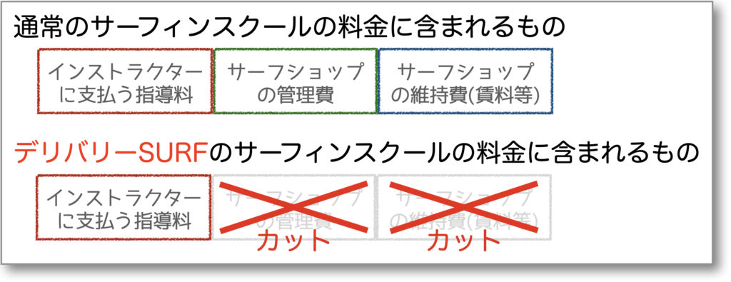 デリバリーSURFでは、無店舗型経営により本来サーフィンスクール開催に必要な多くの費用をカットしています。