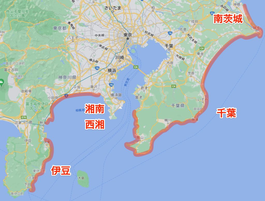 出張が可能な対象地域は広く、湘南や西湘はもちろんのこと、千葉、茨城(神栖市周辺)、伊豆(東伊豆・南伊豆)をカバーしています(地図の赤線部分)。