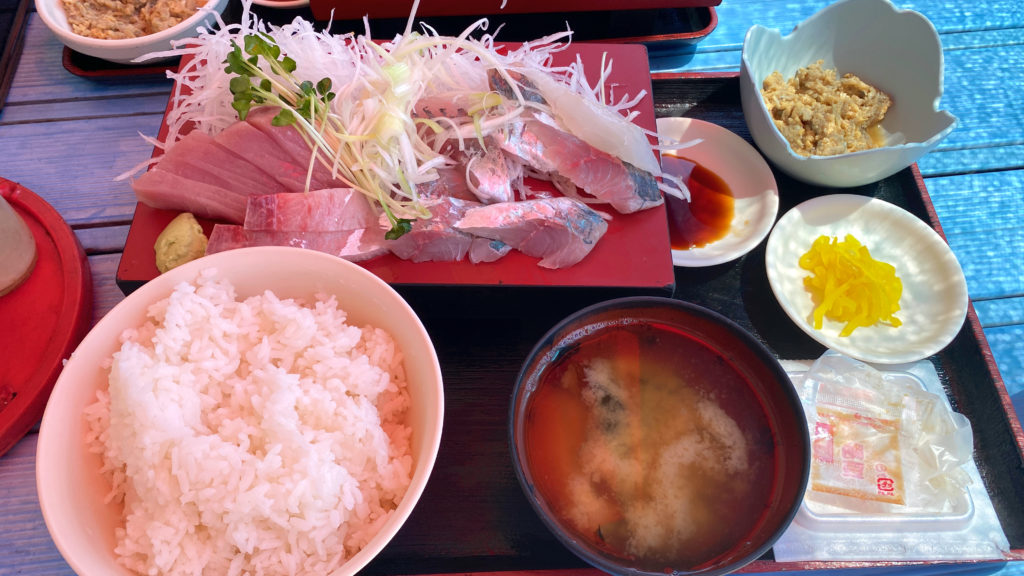 鵠沼でテイクオフスクール サーフィンスクール 2021.07.19 今日は鵠沼でサーフィン体験プランのサーフィンスクール。 ココは駐車場ですが、早速はじまってますよ。 スクール後は、いつもの逗子の海鮮食堂にて。写真はブリと真アジの刺し身2点盛り定食、これで1,000円です。アジは、、、いや、味は保証付き♪
