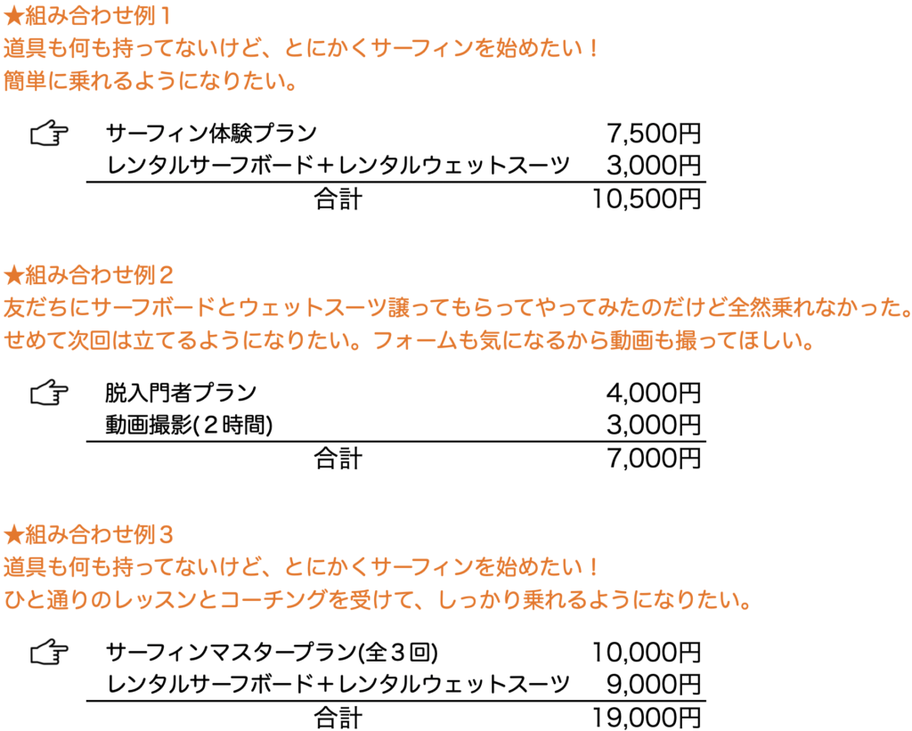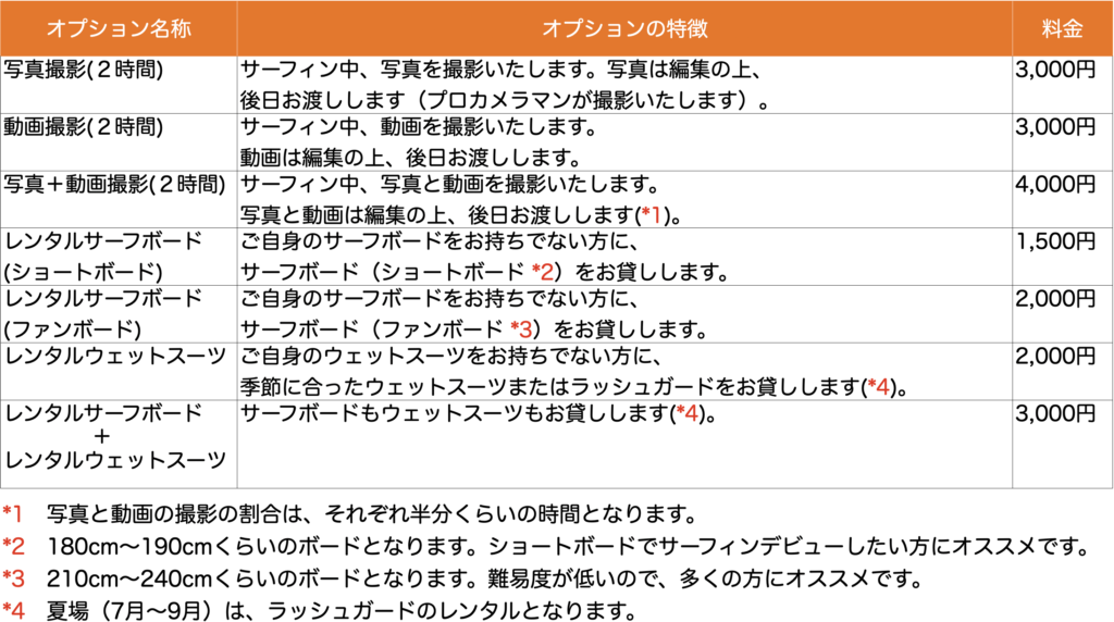 いくつかのプランをご用意しております。まずは以下の基本料金からお選びください。サーフボードやウェットスーツは持ち込みしていただいてもOKですが、お持ちでない方は、その下のオプション料金から必要なものをお選びください。