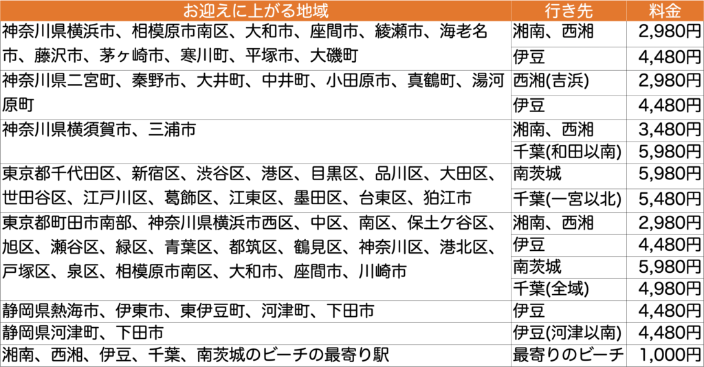 以下のリストにない地域の送迎については適宜ご相談ください。